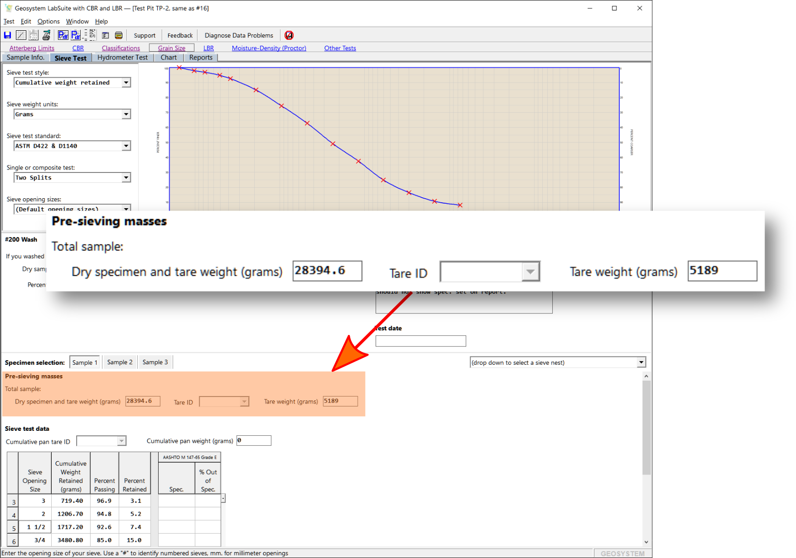 If your sieve test follows the less complicated ASTM D422, AASHTO T 27 or related procedures, your data entry process will be less complicated. For each sample that you sieve — both the original sample, and any samples you split then test -- you'll need to enter the sample mass (i.e., the mass of the material placed onto the top sieve of the sieve stack).