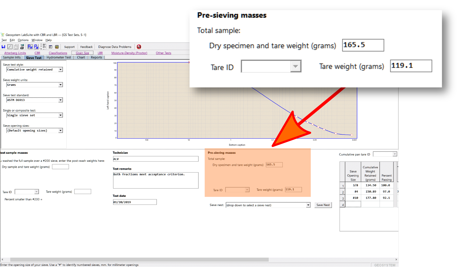 Once you've entered your sample masses and technician/test remarks/test date, it's time to enter your sieves and weight retained on each sieve. Click here for further instructions.